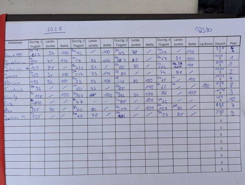 Besonders hervorzuheben ist Jakob, der mit 1204 Punkten auf Platz 2 landete. Obwohl er nicht ganz oben auf dem Podium stand, zeigte er mit 360 Sekunden im ersten Durchgang die längste Einzelflugzeit des gesamten